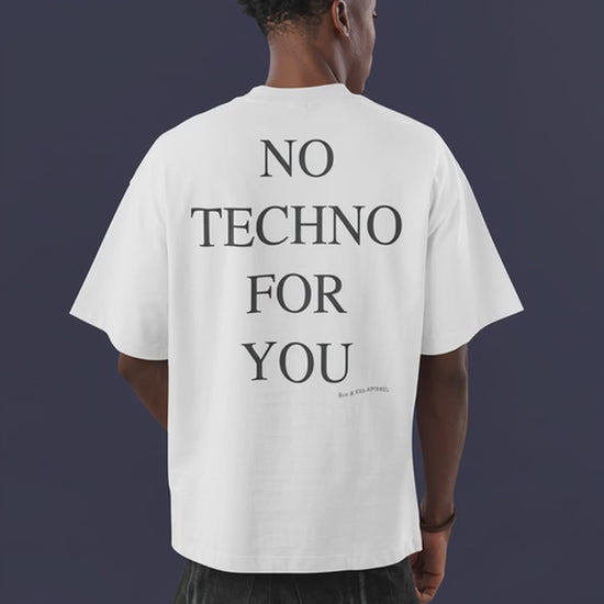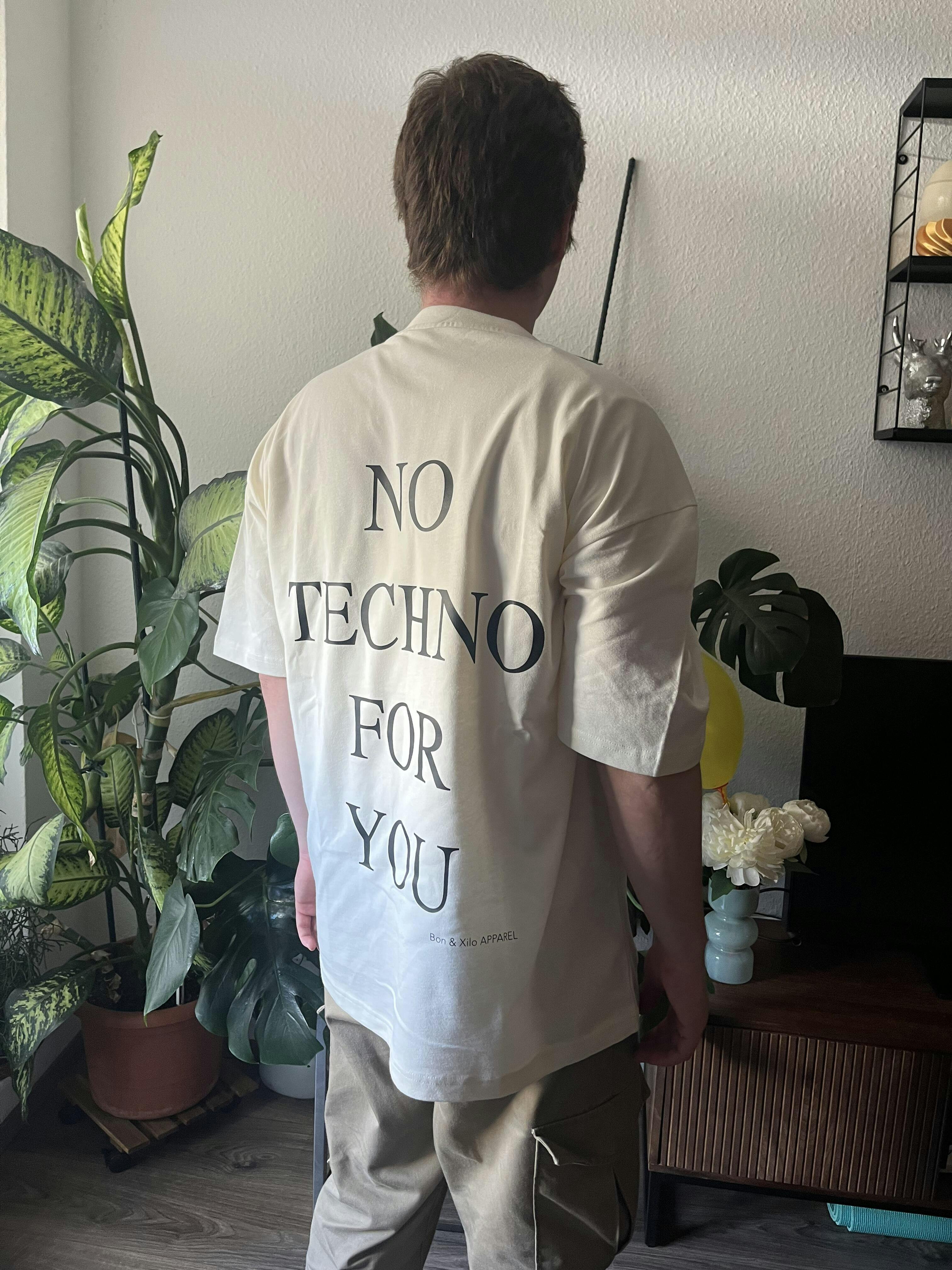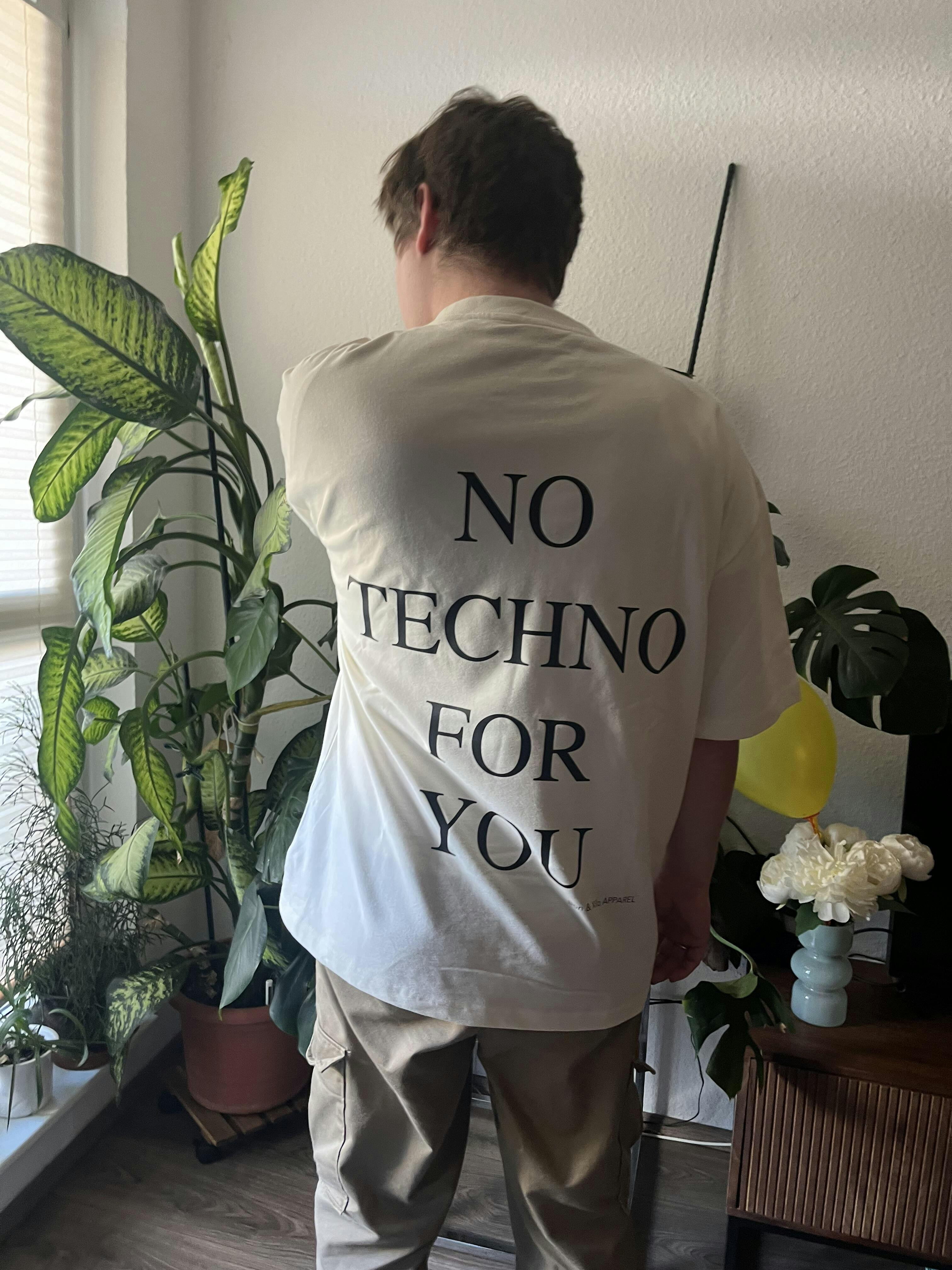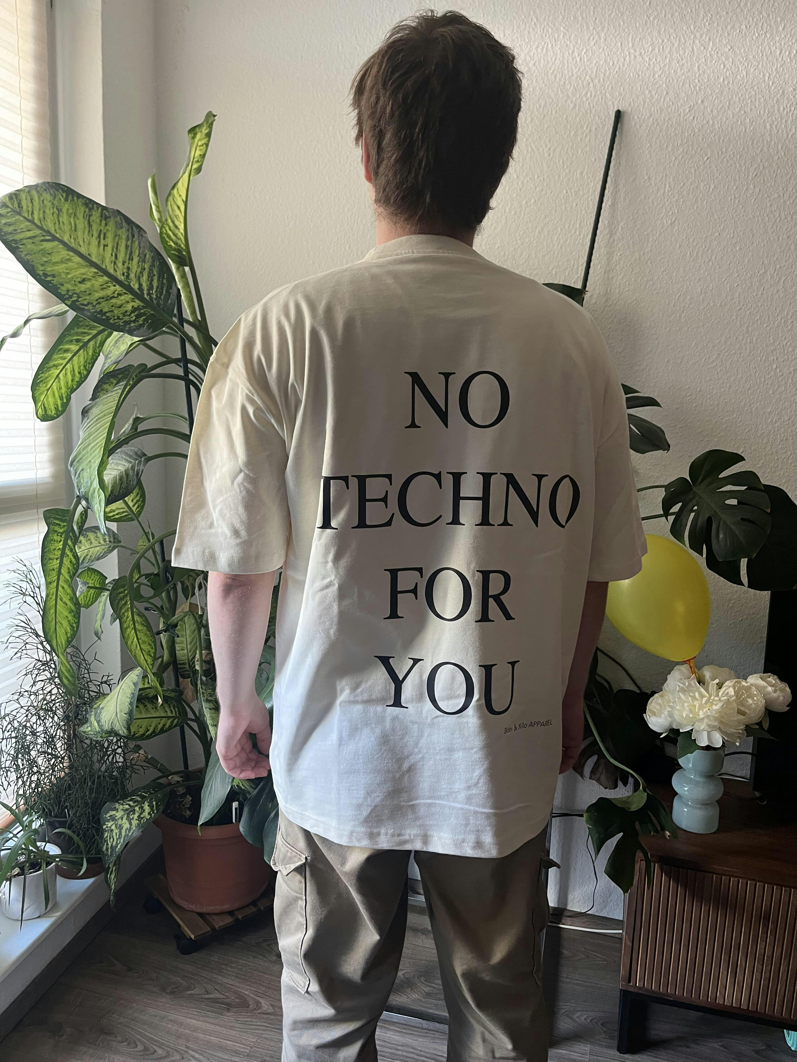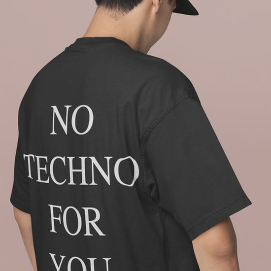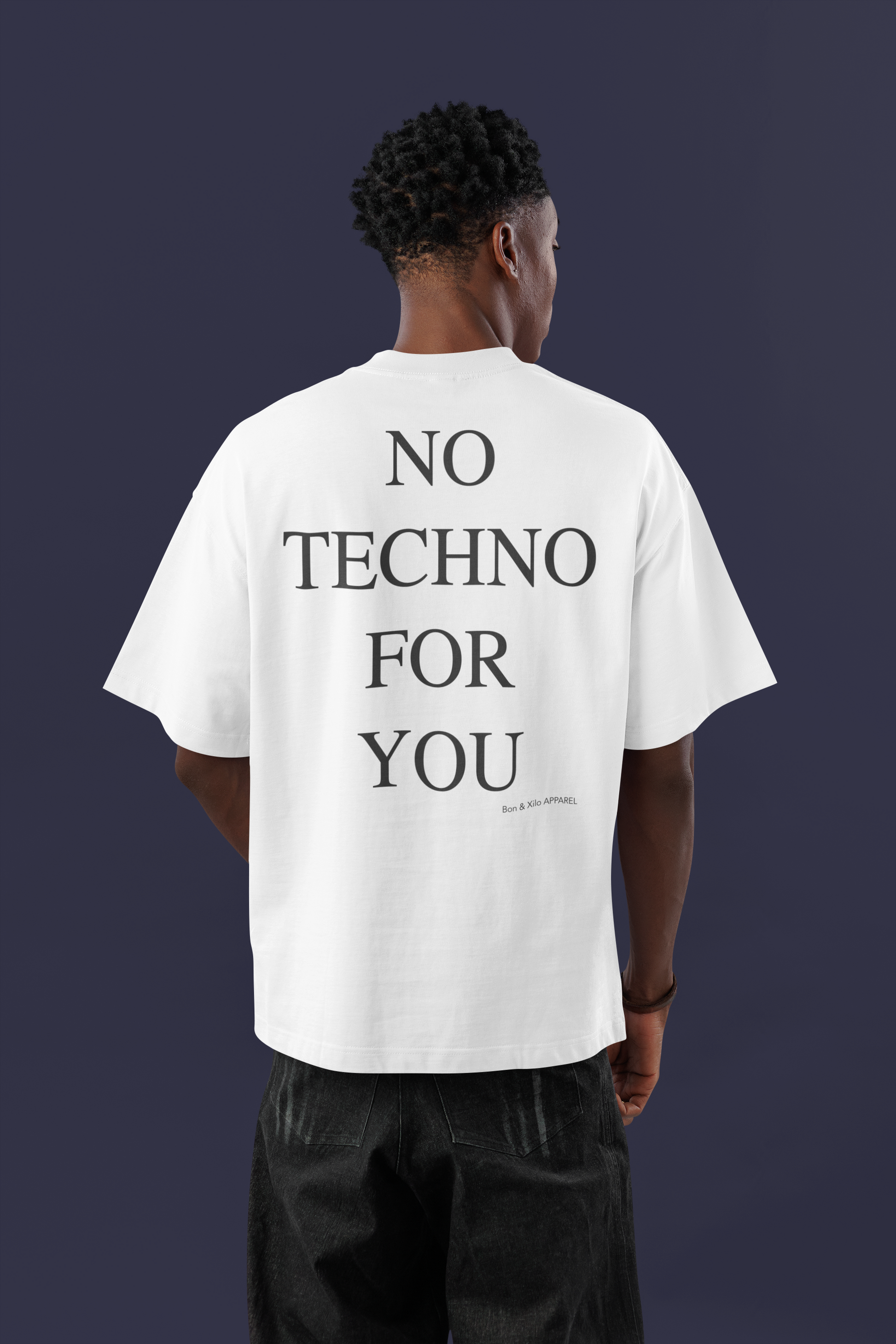 - Back: "NO TECHNO FOR YOU" in bold serif – Front: Blank, like your energy levels